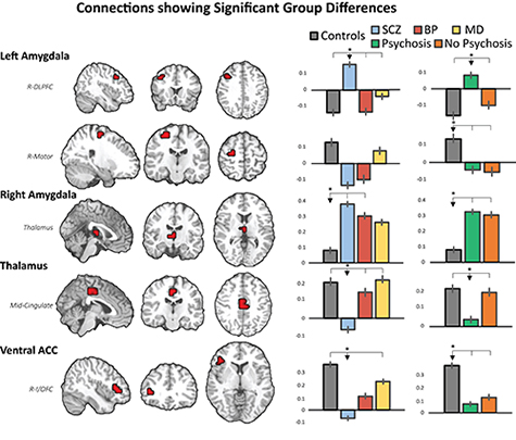 Functional connectivity changes in neonates whose mothers were diagnosed with schizophrenia (SCZ), bipolar disorder (BP), and mood-disorder not-otherwise-specified (MD), compared with normal controls (Controls).